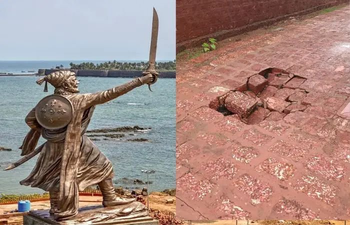 मालवण येथील राजकोट किल्ल्यावरील छत्रपती शिवाजी महाराजांच्या पुतळ्याच्या चबुतऱयाजवळ भगदाड पडल्यानंतर आसपासचा परिसर खचण्याची शक्यता निर्माण झाली आहे. त्यामुळे राजकोट किल्ला पर्यटकांसाठी बंद करण्यात आला.राजकोट किल्ल्यावर छत्रपती शिवाजी महाराज यांचा पहिला पुतळा कोसळल्यानंतर तिथे दुसरा 83 फूट उंच पुतळा उभारण्यात आला. त्यासाठी 100 कोटी रुपये खर्च केला गेला. महाराजांचा पुतळा 100 वर्षे टिकेल, असा दावा उद्घाटनावेळी मुख्यमंत्री देवेंद्र फडणवीस यांनी केला होता; परंतु महिनाभरातच चबुतऱयाजवळ भगदाड पडले. चबुतऱयाच्या किनाऱयालाही तडे गेले. निकृष्ट बांधकामामुळे ही परिस्थिती ओढवल्याचा आरोप होत आहे.समुद्रापासून राजकोट किल्ला दूर आहे. त्यामुळे समुद्राच्या पाण्यापासून किल्ला किंवा छत्रपती शिवाजी महाराजांच्या पुतळय़ाला धोका नाही. मात्र पुतळय़ाच्या परिसरात झालेले बांधकाम अत्यंत निकृष्ट दर्जाचे झाल्यामुळे परिसर खचत आहे. त्यामुळे पुतळय़ाला धोका निर्माण झाला आहे. हे निकृष्ट बांधकाम करणाऱया अधिकाऱयांवर सरकारने तातडीने व कठोर कारवाई केली पाहिजे, अशी मागणी शिवसेनेचे माजी आमदार वैभव नाईक यांनी केली आहे.