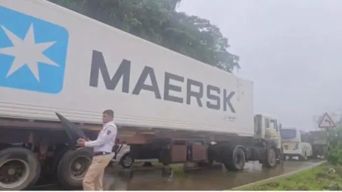 मुंबई-गोवा महामार्गावरील खेड तालुक्यातील भोस्ते घाटात काल सायंकाळी अचानक एका ट्रकला तांत्रिक बिघाड झाल्याने ट्रक घाटाच्या चढावरच बंद पडला. या घटनेमुळे महामार्गावरील वाहनांची लांबच लांब रांग लागल्या होत्या परिसरात वाहतूक कोंडीची परिस्थिती निर्माण झाली होती. संबंधित यंत्रणे तातडीने घटनास्थळी धाव घेत ट्रक बाजूला करण्याचे प्रयत्न सुरू केले. दरम्यान, वाहतुकीसाठी घाटामध्ये सध्या एकेरी मार्गाने वाहनांना सोडण्यात येत होती