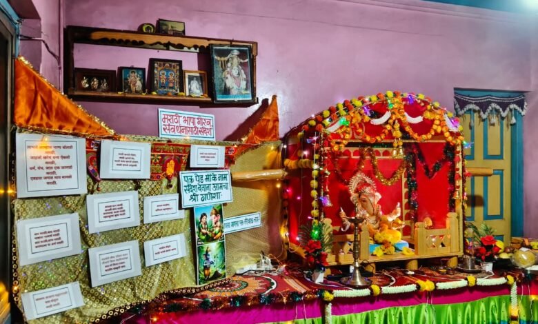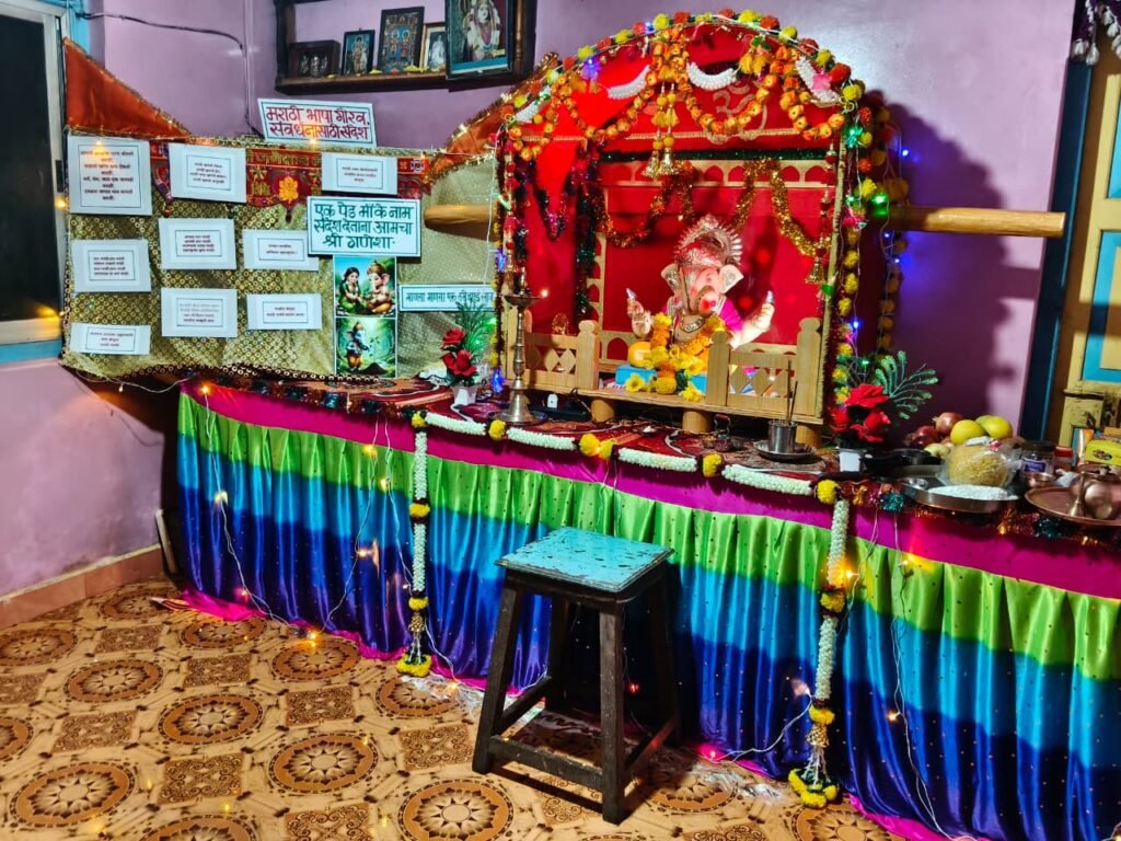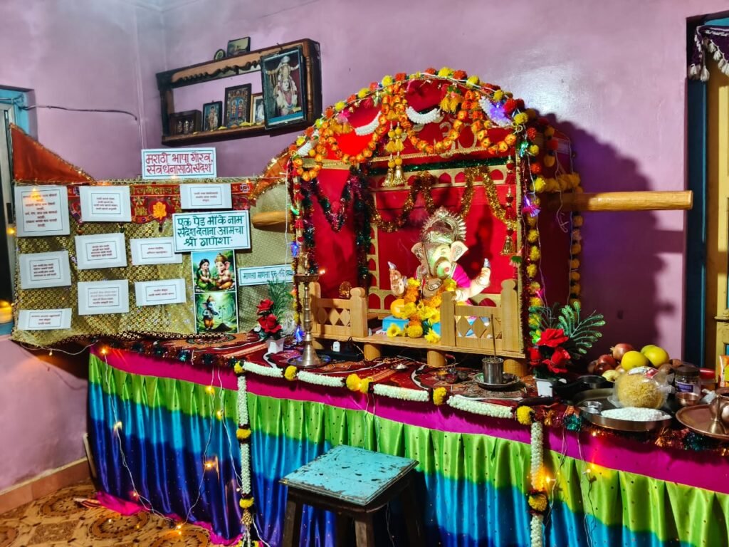 गणेशोत्सवात पालखी देखावा,एक पेड मा के नाम संदेश, सजावटीतून मराठी भाषा गौरव व संवर्धन संदेश.