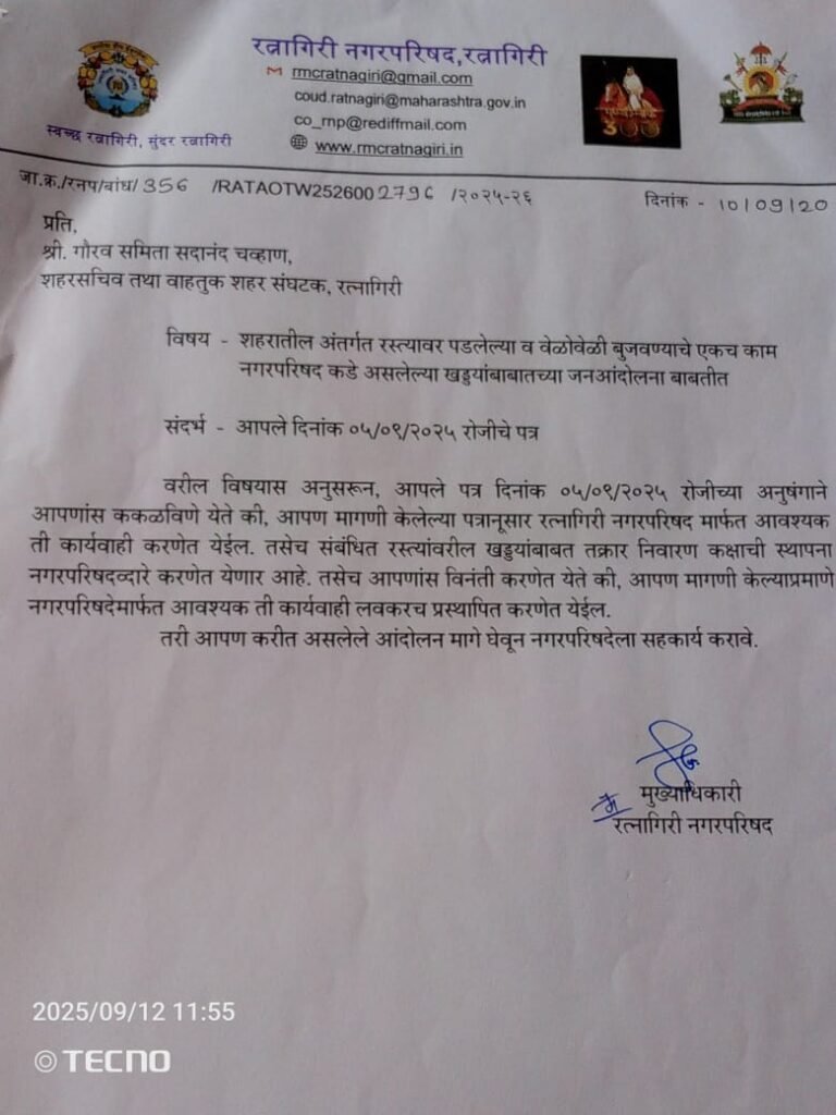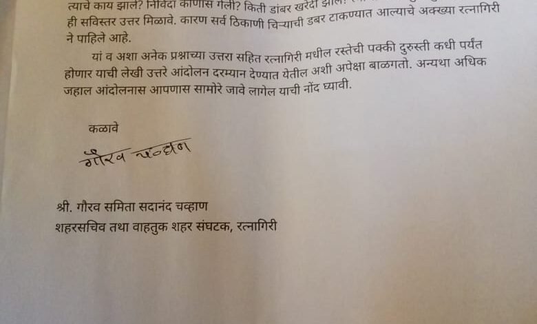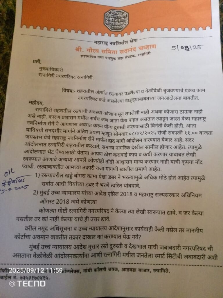 2018 साली मुंबई हायकोर्टाने दिलेल्या निर्णय व त्यांनंतर राज्य शासनाने त्याचा बनविलेली अधिसूचनेचा दाखला देत नगरपालिका मध्ये खड्डे बाबतीत तक्रार नोंदणी कक्ष स्थापन करणे बंधनकारक आहे. सदर कक्षामध्ये आलेल्या तक्रारी बाबतीत ताबडतोब कारवाई करु न संबंधित तक्रारदारास तसेच अवगत करावे. दर तीन महिन्यांनी राज्या शासनास खड्डे व त्याबाबत आलेल्या तक्रारी आणी त्यावर केलेली करावाई याचा अहवाल सादर करावा लागतो. यां आदेशाची रत्नागिरी जिल्ह्यात कोठेही अंमलबजावणी होताना दिसत नाही किमान जिल्ह्याचे ठिकाण असलेल्या रत्नागिरी नगरपालिका मध्ये याची अंमलबजावणी होऊन तशी तात्काळ करावाई सुरु व्हावी. रत्नागिरी शहरातील खराब रस्ते तात्काळ दुरुस्त करून पावसाळा संपताच नवीन रस्ते बांधणी करावी अशा मागण्या मनसे तर्फे देण्यात आल्या होत्या अन्यथा जनतेसह खड्ड्यामध्ये आंदोलनास सुरुवात करणार असा इशारा देण्यात आला होता.