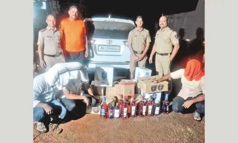 गोवा राज्यातून सिंधुदुर्ग मार्गे होत असलेल्या बेकायदेशीर दारू वाहतुकीवर बांदा पोलिसांनी धडक कारवाई केली. या कारवाईत पुणे जिल्ह्यातील तिघांना अटक करून तब्बल 16 लाख 15 हजार 820 रुपयांचा मुद्देमाल जप्त करण्यात आला आहे.कारवाईमध्ये विशाल शिवाजी वाबळे (वय 25, रा. कारखेल, ता. बारामती), गौरव किरण रणधीर (26, रा. वरवंड, ता. दौंड), साहिल अशोक लोंढे (23, रा. हिंगनिगाडा, जि. पुणे) यांना ताब्यात घेण्यात आले. शनिवारी पहाटे 4.30 वा.च्या सुमारास ही कारवाई विलवडे येथील छत्रपती शिवाजी महाराज चौकात करण्यात आली. इनोव्हा क्रिस्टा गाडीतून ही गोवा दारू पुणे येथे नेण्यात येत होती. पोलिसांनी गाडीची तपासणी केली असता रम, विस्की आदी विविध ब्रँडच्या दारूच्या बाटल्या मोठ्या प्रमाणात आढळल्या. बाजारभावानुसार जप्त दारूची किंमत 1 लाख 50 हजार 820 रुपये इतकी असून, गाडी आणि दारूसह एकूण मुद्देमाल 16 लाख 15 हजार 820 रुपयांचा असल्याचे पोलिसांनी सांगितले.