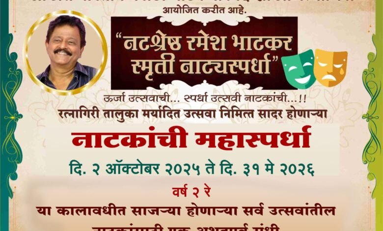 रत्नागिरी : अखिल भारतीय मराठी नाट्य परिषद शाखा रत्नागिरी आयोजित नटश्रेष्ठ रमेश भाटकर स्मृती उत्सवी नाटकांच्या स्पर्धेची उद्घोषणा अखिल भारतीय मराठी नाट्य परिषदेचे विश्वस्त डॉ. उदय सामंत यांनी केली आहे. गतवर्षी प्रमाणेच रत्नागिरी तालुक्यासाठी मर्यादित असलेली ही स्पर्धा २०२५ – २६ या वर्षीही मोठ्या उत्साहात आयोजित करत असल्याचे त्यांनी या वेळी सांगितले.