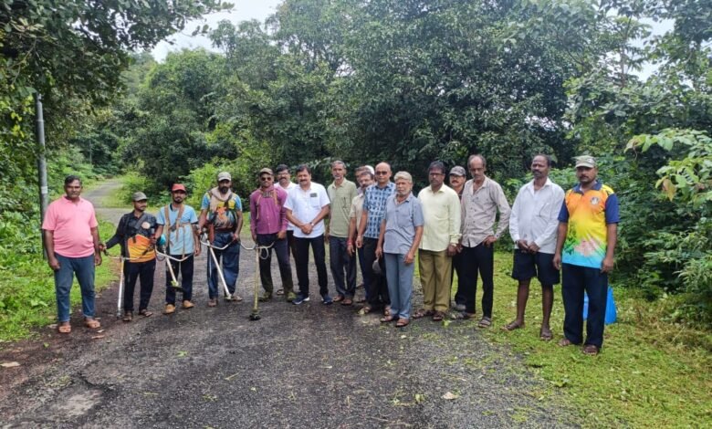बिबट्याच्या हल्ल्यापासुन खबरदारी म्हणुन भाजपा जिल्हा उपाध्यक्ष अभिजित गुरव यानी रस्त्यावरील झाडी तोडत केली स्वच्छता मोहिम