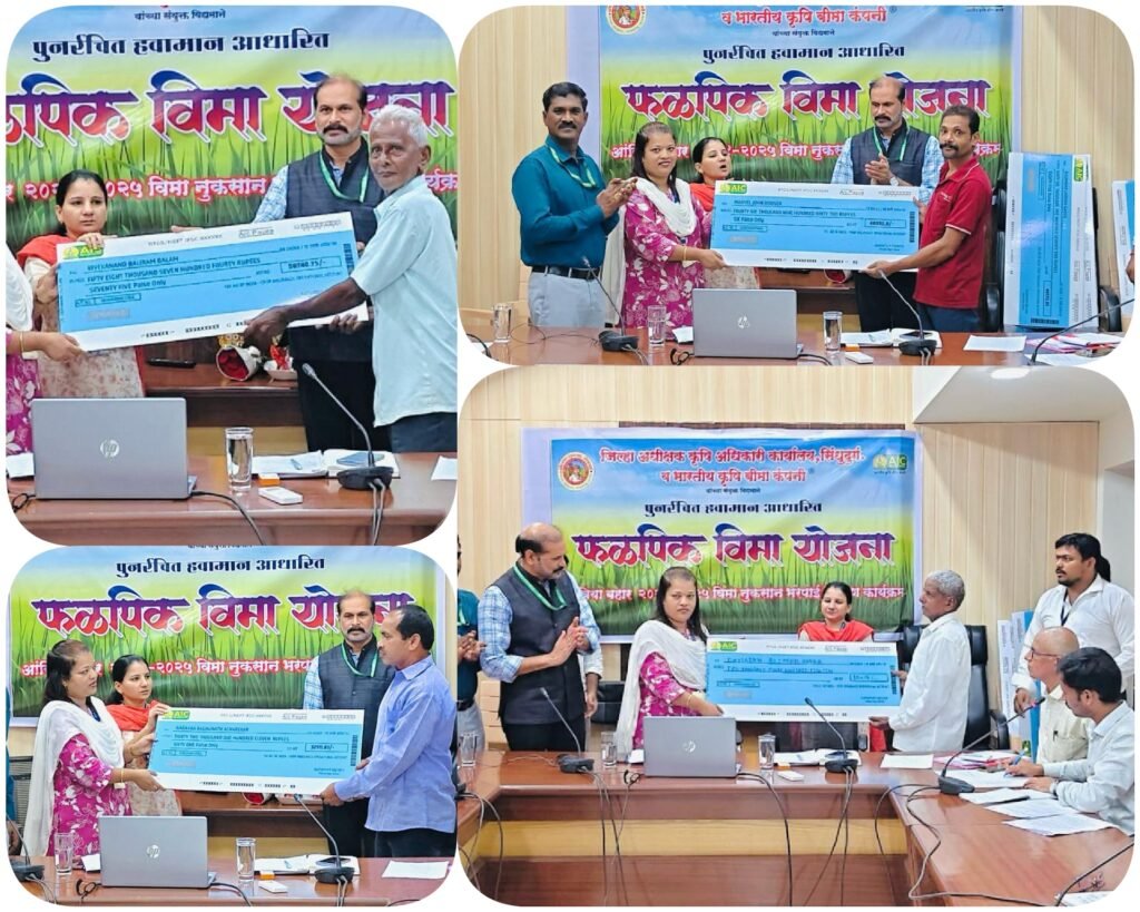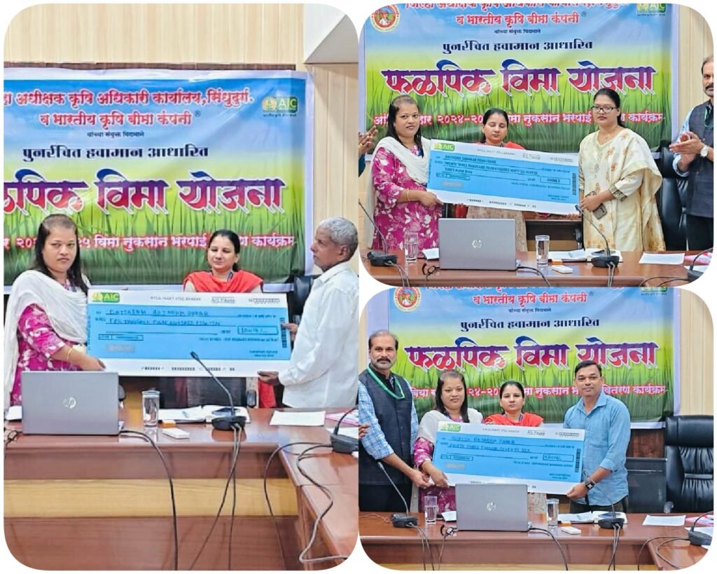 सन २०२४-२५ मध्ये जिल्ह्यातील जवळपास ४२००० पात्र शेतकऱ्यांना जवळपास रक्कम रु.९० कोटी एवढी विमा नुकसान भरपाई रक्कम दिवाळीपूर्वी वितरीत करण्यात येत आहे. यामध्ये आंबा पिकासाठी अधिकतम प्रति हेक्टरी रुपये ८६०००/- तर काजू पिकासाठी अधिकतम प्रती हेक्टरी रुपये ५७६००/- एवढी नुकसान भरपाई शेतकऱ्यांच्या खात्यात अदा होणार आहे. आज झालेल्या कार्यक्रमात यातील १५ शेतकऱ्यांना नुकसानभरपाईचा धनादेश सुपूर्द करण्यात आला. पालकमंत्री नितेश राणे यांच्या विशेष प्रयत्नांमुळे शेतकऱ्यांना नुकसानभरपाईचा लाभ मिळाला आहे. शेतकऱ्यांना पीकविमा नुकसानभरपाई वितरित कारणारा सिंधुदुर्ग हा राज्यातील पहिला जिल्हा ठरला आहे.