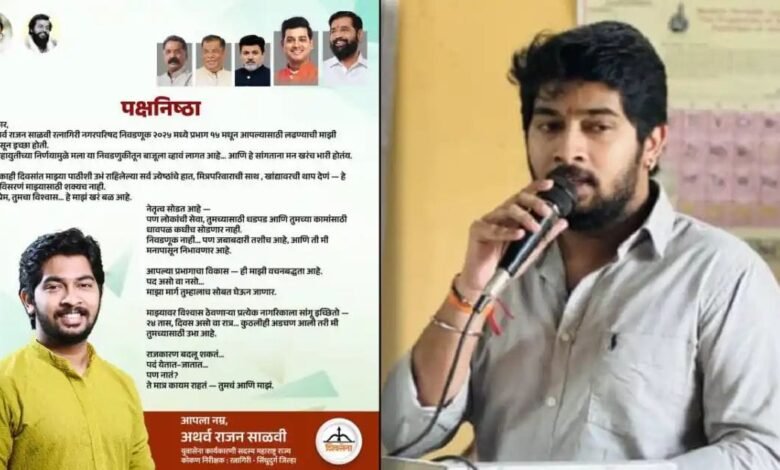• रत्नागिरी नगरपरिषदेच्या निवडणुकीसंदर्भात शिवसेनेने (शिंदे) घेतलेल्या एका निर्णयामुळे स्थानिक राजकारण तापलं आहे. शिवसेनेची (उबाठा) साथ सोडून एकनाथ शिंदे यांच्या शिवसेनेत गेलेले माजी आमदार तथा नगराध्यक्ष राजन साळवी यांचे पुत्र अथर्व साळवी हे प्रभाग क्रमांक १५ मधून रत्नागिरी नगर परिषदेची निवडणूक लढवण्यास इच्छूक होते. मात्र, त्यांना उमेदवारी नाकारण्यात आली आहे. यामुळे राजन साळवींना मोठा धक्का बसला आहे. अशात. अथर्व साळवी यांनी एक भावनिक पत्र लिहून समाजमाध्यमांवर शेअर केलं आहे.