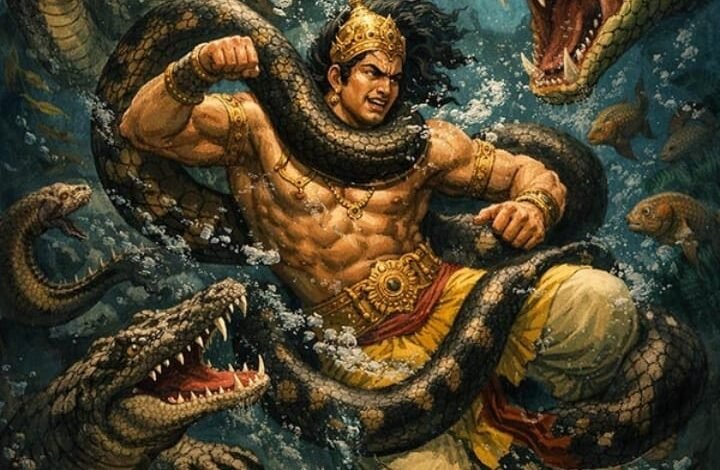 अर्जुनाने नारदांचे म्हणणे ऐकले. वाचकहो, शस्त्रांचा तारतम्याने वापर करावा, हा धडा या कथेतून मिळतो. नंतर ही सर्व मंडळी विशाखयुप नावाच्या ठिकाणी आली. त्या परिसरातून जात असताना एका अजगराने भीमाला पकडले आणि आपल्या विळख्यात त्याला आवळले. भीमाला आपल्या शक्तीचा खूप गर्व होता, पण त्याचा तो गर्व पूर्णपणे गळून पडला. हा अजगर म्हणजे पूर्वजन्मीचा नहुष राजा होता. आपल्या सामर्थ्याने त्याने इंद्रपद प्राप्त केले होते, पण उच्चपदी गेलेला माणूस जसा चळतो, तसे त्याचे झाले होते. त्याने आपली पालखी वाहण्याचे काम ऋषींकडे सोपवले होते आणि एक ऋषी हळूहळू चालत आहेत, असे लक्षात आल्यावर त्यांना लाथ मारली होती. गर्वाने धुंद झालेल्या या राजाला अगस्ती ऋषींनी शाप दिला आणि त्यामुळे तो अजगररूपामध्ये आला होता. “ज्यावेळी धर्मराज युधिष्ठिर तुला स्पर्श करेल तेव्हाच तू मुक्त होशील”, असे अगस्तींनी सांगितले होते. बराच वेळ झाला, तरी भीम कुठे दिसेना. म्हणून युधिष्ठिर त्याला शोधत त्या ठिकाणापर्यंत आला. अजगराच्या विळख्यातील भीमाला पाहून युधिष्ठराला खूप वाईट वाटले आणि त्याने अजगराची प्रार्थना केली. त्यावेळी तो अजगर मनुष्यवाणीने बोलू लागला. तो म्हणाला, “माझ्या एका प्रश्नाचे उत्तर तू दिलेस तर मी भीमाला सोडेन.” युधिष्ठिराने प्रश्न विचारायला सांगितले. अजगराने विचारले, “जर एखाद्या शूद्र माणसाकडे सत्यदान इत्यादी सद्गुण असतील, तर त्याच्यात आणि ब्राह्मणात काय फरक आहे?” त्यावर युधिष्ठिराने सांगितले, “ज्या व्यक्तीकडे सत्यदान इत्यादी सद्गुण आहेत, ज्याचे आचार पूर्ण शुद्ध आहेत, तो माणूस ब्राह्मणाइतकाच पवित्र आहे. तो कोणत्याही प्रकारे ब्राह्मणापेक्षा कमी दर्जाचा नाही.” आणि अजगराने त्या उत्तराने प्रसन्न होऊन भीमाच्या अंगावरील आपले विळखे सैल करायला सुरुवात केली. युधिष्ठिराने त्या अजगराला स्पर्श करताच त्या अजगराचे पुन्हा नहुष राजात रूपांतर झाले.