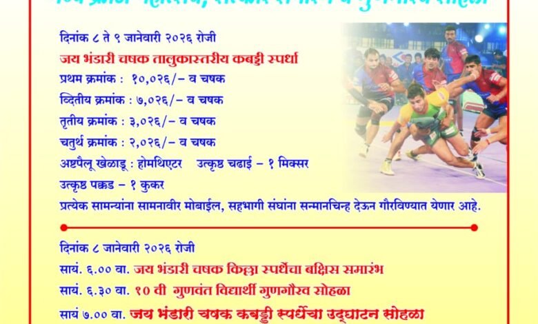 ८ जानेवारी २०२६ रोजी सायंकाळी ६.०० वाजता कबड्डी स्पर्धेचा बक्षीस समारंभ, ६.३० वाजता दहावी गुणवंत विद्यार्थ्यांचा गुणगौरव सोहळा तर ७.०० वाजता ‘जय भंडारी चषक’ कबड्डी स्पर्धेचे उद्घाटन होणार आहे.