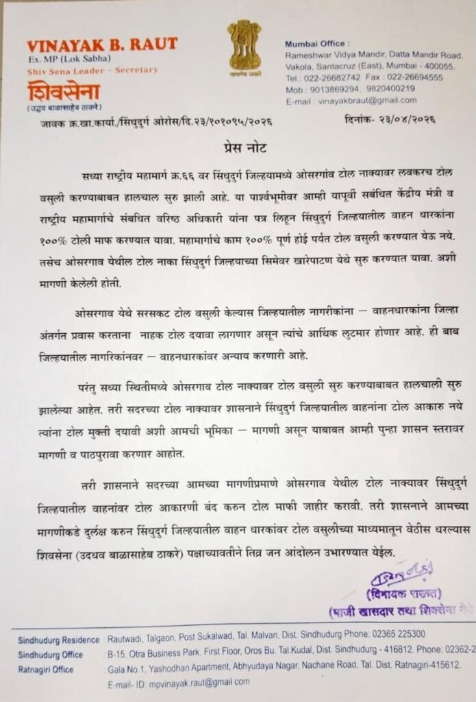शिवसेना नेते माजी खासदार विनायकजी राऊत साहेब यांनी व्यक्त केलेली भूमिका ही केवळ राजकीय प्रतिक्रिया नाही, तर ती कोकणवासीयांच्या मनातील संतापाची थेट अभिव्यक्ती आहे. प्रश्न साधा आहे. रस्ता पूर्ण झालेला नाही, सुविधा अपुऱ्या आहेत, सुरक्षिततेची हमी नाही… मग टोल कसला आणि कशासाठी?