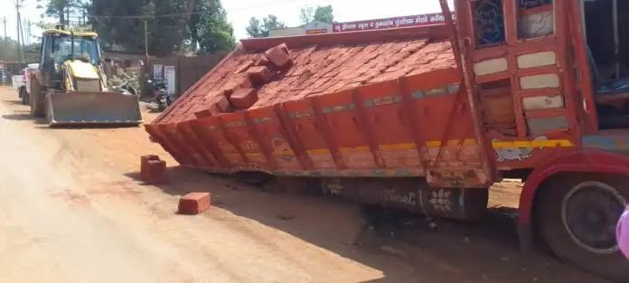 लांज्यात महामार्गाचे गटार खचून ट्रक कलंडला