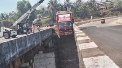 जगबुडी पुलावर अपघाताची मालिका सुरूच ,दुभाजक तोडून दोन पुलांच्या मध्ये अडकला कंटेनर